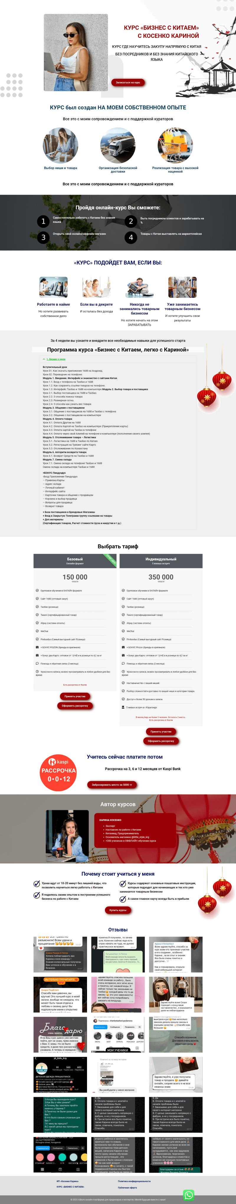 Мы рады представить наш проект – лендинг для Карины Косенко, эксперта и наставника по работе с Китаем. Основной темой лендинга является обучающий курс «БИЗНЕС С КИТАЕМ». Сайт выполнен в ярко красном цвете, что подчеркивает тематику Китая и привлекает внимание пользователей.